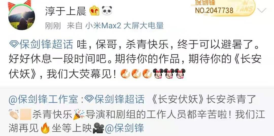 保剑锋微博又传来喜讯,新戏长安杀青,期待票房大卖
