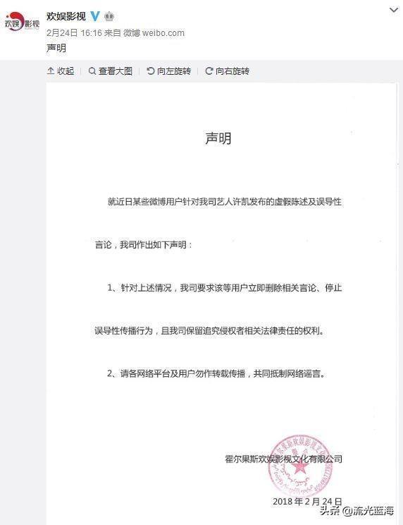 随后许凯所属经纪公司欢娱影视也在微博上发出了正式的声明 。