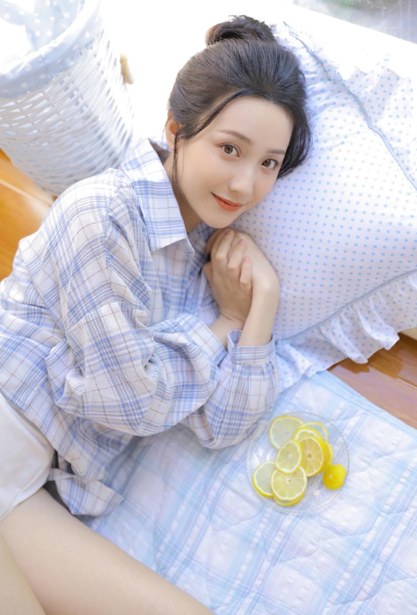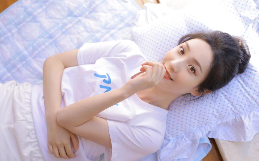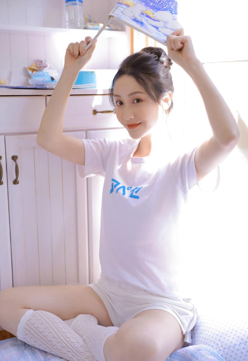 阳光透过轻薄的窗帘,斑驳地洒在一位可爱女生的脸上。她穿着简约的白色短袖和白色短裤,清新得如同初夏的微风。