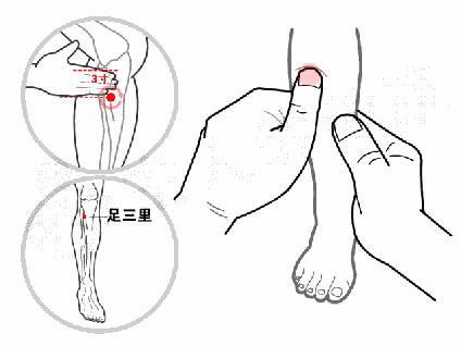 方法:位于小腿前外侧,外膝眼下3寸,距胫骨前嵴约一横指处,当胫骨前肌上。用揉法,揉80~100次。