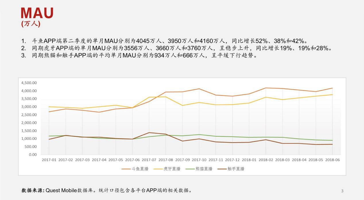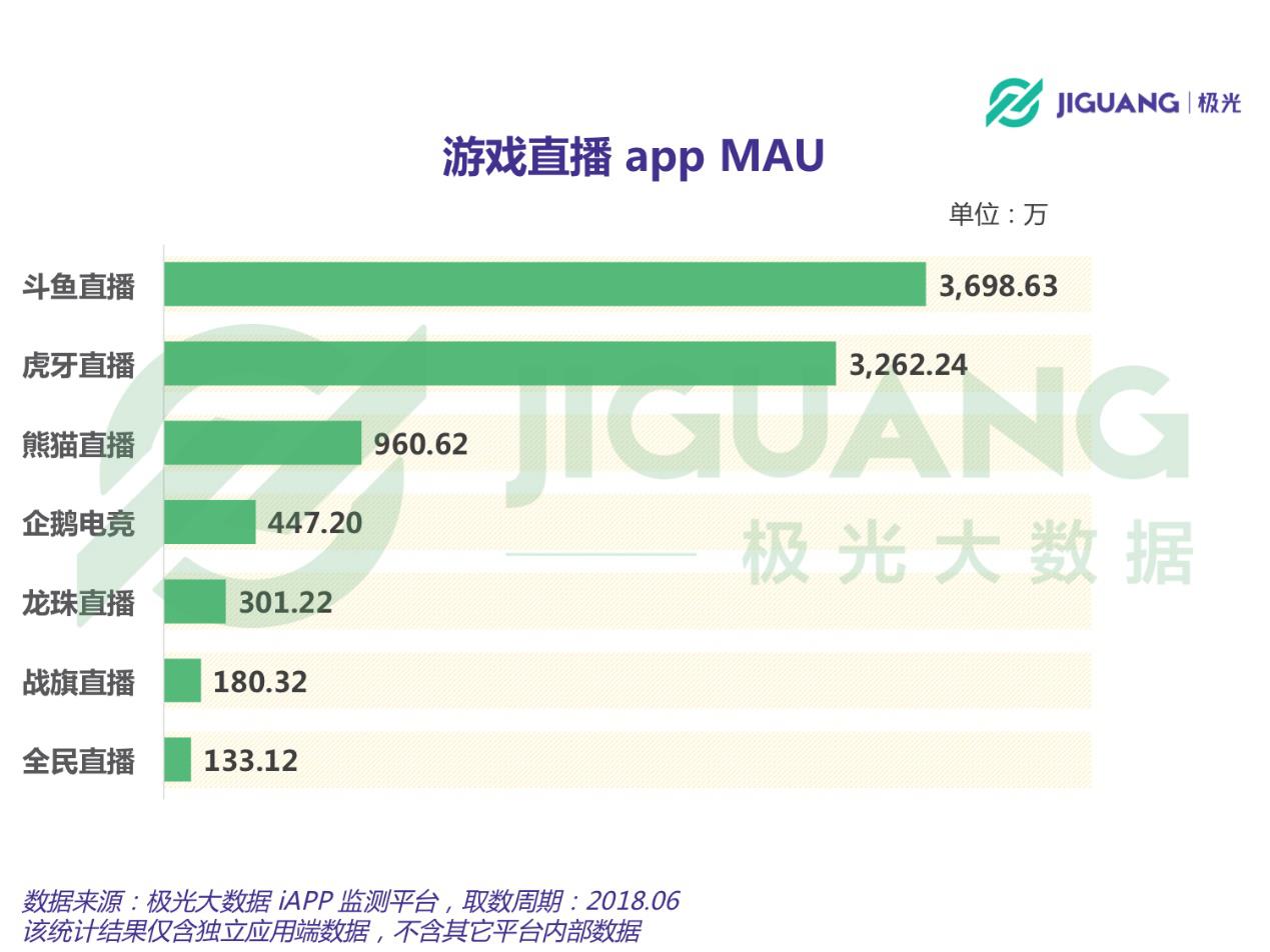 其实真正的能走到今天的平台真心不多,而斗鱼直播,就是靠自己的稳步发展,走到了今天。而且取得了众人都羡慕的成绩,直播排名显示,斗鱼第一!我们一起来看一张斗鱼第二季度单月MAU图同虎牙,熊猫等平台的对比图大家就一目了然了。