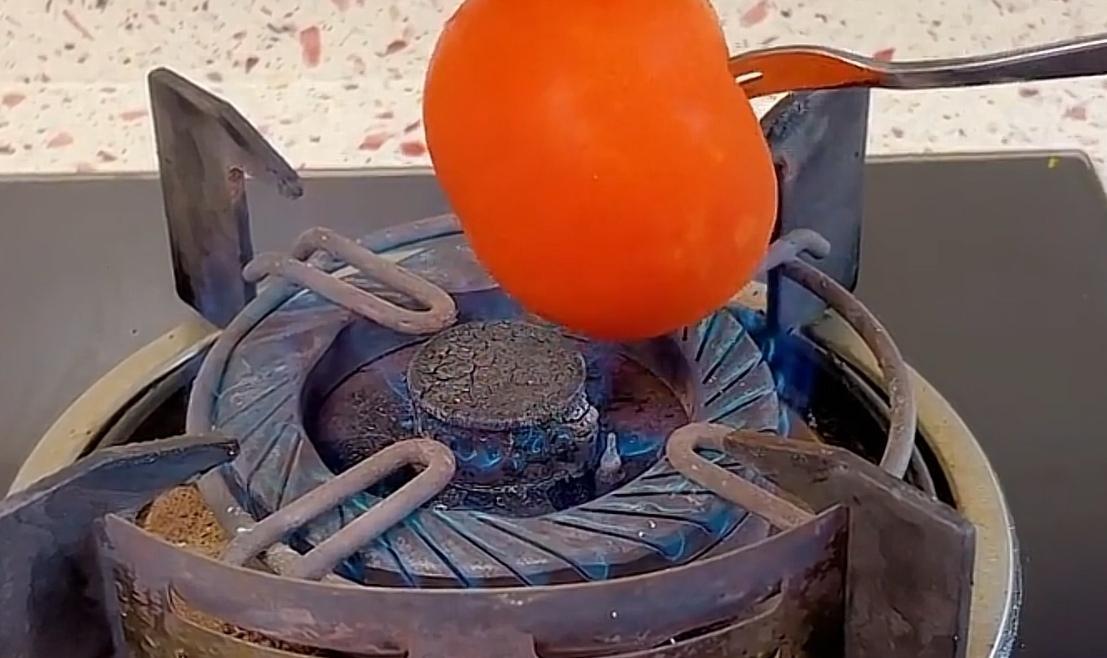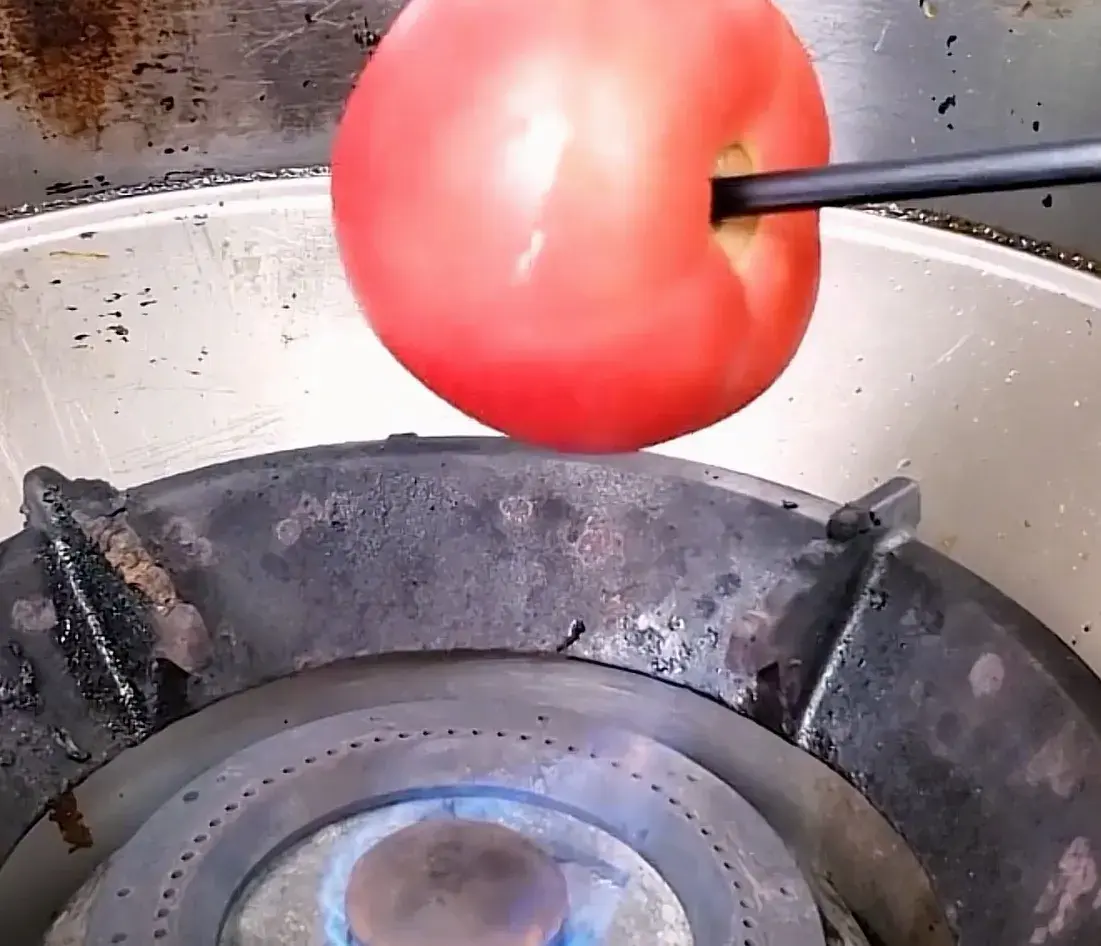 第四种方法是我学会不久的,就是用火烤,刚开始我用一根筷子插在西红柿蒂部,放在炉火上烤,这个翻转几下,很快就能拿过来去皮了,就是筷子取下来时看到有部分烧坏了,不能用了,后来用不锈钢叉子就好多了,这个方法比开水烫还要快,就是燃气炉火烤会不会有毒啊?
