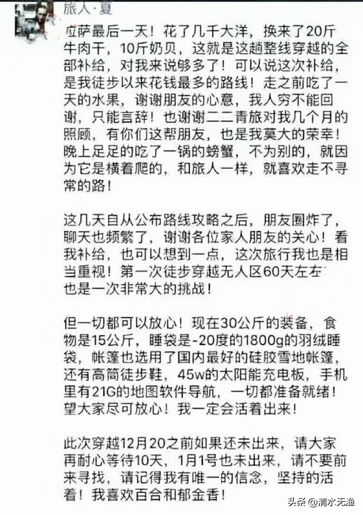 10 月 23 日,刘银川再度发了一条朋友圈,表示计划用 2 个月时间完成此次无人区的穿越,从 10 月 23 日起,如果成功,12 月 23 日便能走出,如果到时未出,就再多等 10 天,若 10 天过后,仍未成功返程,他不希望给众人添乱,也恳请大家不必耗费人力物力找寻他,只要能记住他钟爱的花就行。