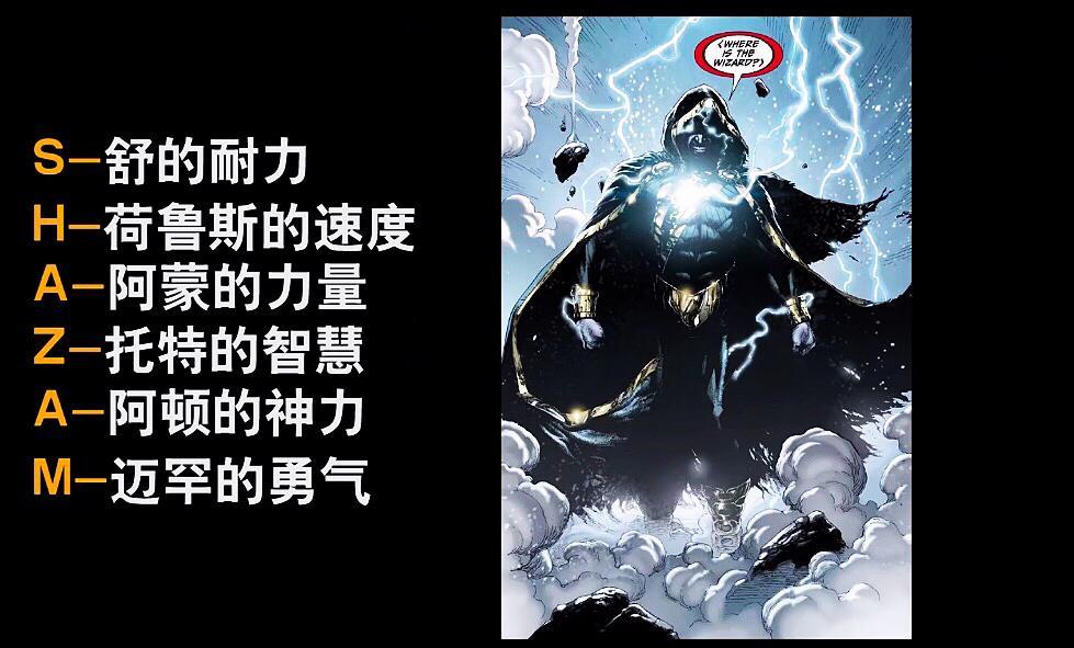 19.神秘大反派黑亚当。当比利获得沙赞之力时,巫师表示他曾经选错过一个人。这个人就是埃及人特斯·亚当。在亚当获得了埃及六神之力后,最终误入歧途化身为黑亚当。漫画中,黑亚当是沙赞的头号宿敌!
