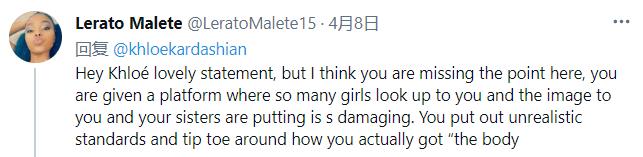 “嘿,科勒,你的声明真不错,但我认为你没有抓住重点,你在一个无数女孩都崇拜你的平台上,和你的姐妹们展示了有害的形象。是你制定了不切实际的标准,现在却又来粉饰自己的真实身材。”