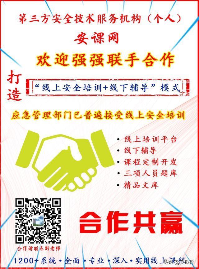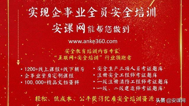 安课网www.anke360.com,安全教育培训内容专家,“互联网+安全培训”行业领跑者。安课网已经上线的1200+线上安全培训视频课程,覆盖全行业,系统、全面、专业、深入、实用。安课网还提供50000+精品安全生产文档资料、安全生产三项人员考证题库、一建和二建考证题库、一级注消考证题库、注安考证题库。安课网线上+线下安全培训,能够帮助企事业单位实现高效、全员安全培训,提升企事业单位本质安全水平。