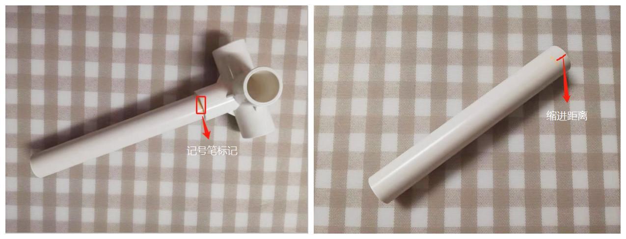 将PVC管插入即将要连接的接头中,使用记号笔做好标记。拔出后即可进行测量。如下图: