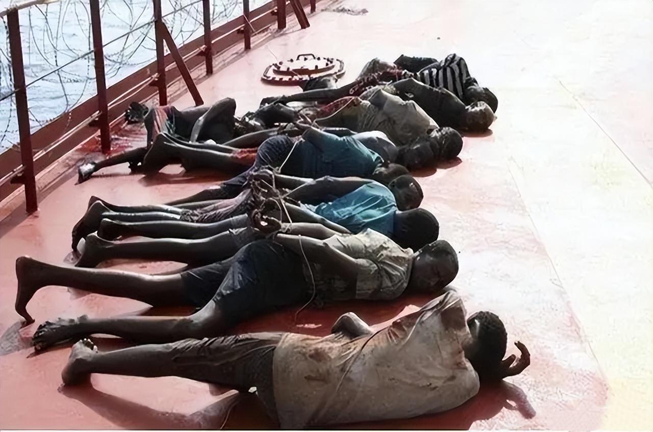 一问才知道,这些误打误撞的铁头娃,都是来自于索马里的海盗。这些胆大包天的海盗得罪了美军,当然没有好果子吃。直接被美军捆起来丢到了甲板上。