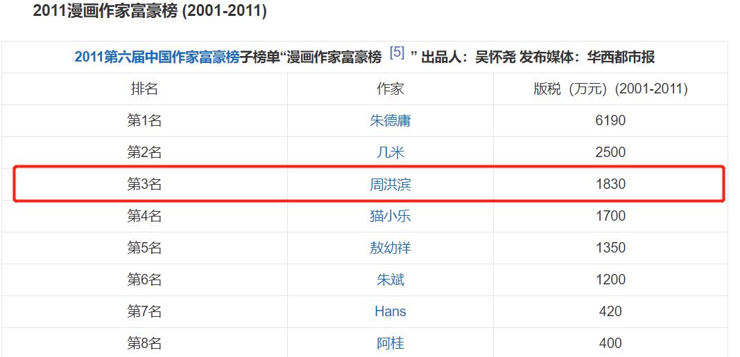 2011年度,周洪滨凭借《偷星九月天》的版税收入高达1084.8万元,再加上之前的连载版税收入,他总共收入1830万元,被列入了“中国漫画作家富豪榜”第三名。让人惊叹的是,从生活仅够维持的创业小白,成为千万富翁,周洪滨总共就花了5年的时间。