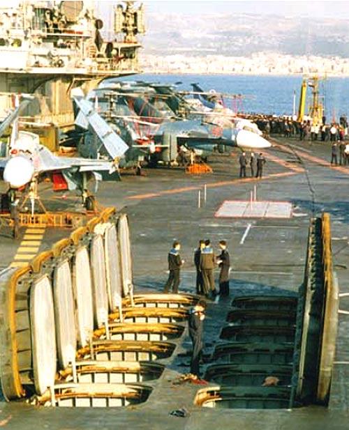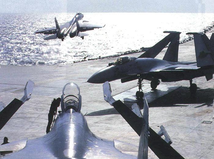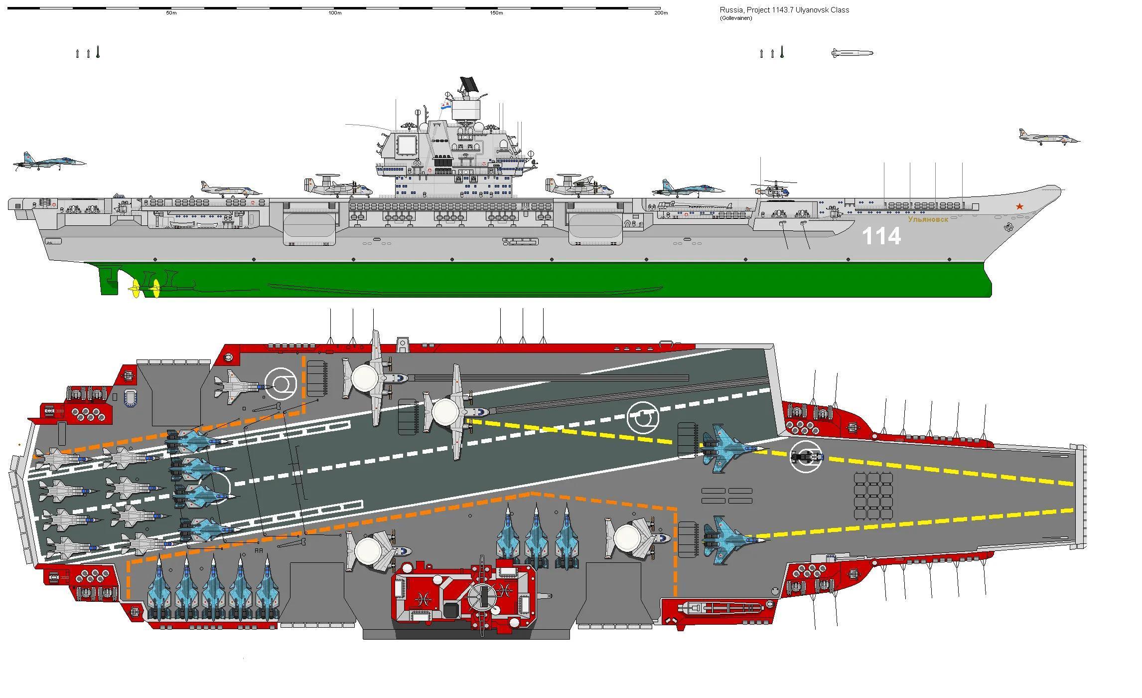 舰载机联队:27架SU-27K/SU-33(这俩实际上是一个就是名字不一样)27架MIG-29K,10架SU-25,以及数量不详的雅克-141,15-20架卡-25与卡-31,以及4架雅克-44预警机。