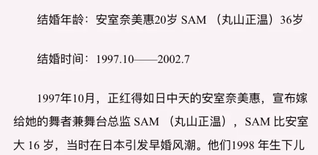 并在演艺事业的上升期,嫁给了舞者丸山正温,生下他们的儿子丸山温大,20岁奉子成婚,无论在现在还是当年,都创下了偶像早婚纪录,本以为幸福生活触手可及,接下来的一个个悲剧,却让安室本就坎坷的人生变得更加多舛。