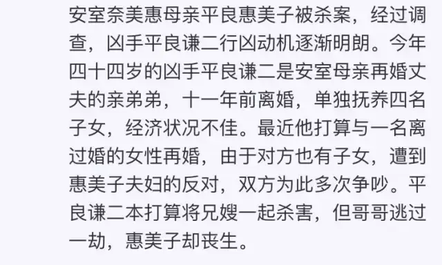 目击者与幸存者只剩下安室的继父,他向警方交代惠美子被杀是因为夫妻俩均激烈反对谦二与一名四十多岁的失婚女子交往,激怒了他,谦二痛下杀心,先袭击了惠美子,而他却躲过一劫。