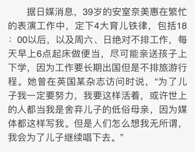 多年来,安室一边努力工作,一边奉行育儿铁律,比如周六日绝对不安排工作,比如每天早上6点起床做便当。
