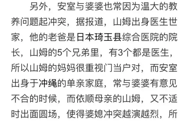 婆媳关系不和更是让安室痛苦不堪,丸山正温家里是医生世家,婆婆一直很注重门当户对,对艺人出身又是单亲家庭的安室存在一定的偏见与歧视。
