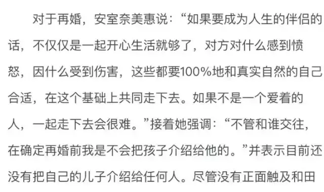 安室迄今都没有再婚,期间谈过几段轰轰烈烈的恋爱,但她坦言只有真正下了决心要结婚的对象出现,才会把他介绍给儿子。