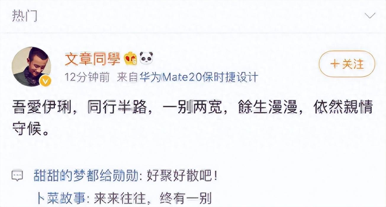 2019年7月28日,文章在社交网站上如是说道,官方宣布了他和马伊琍离婚的的消息,相识24年,结婚11年,这段关系还是走到了尽头,让人唏嘘。