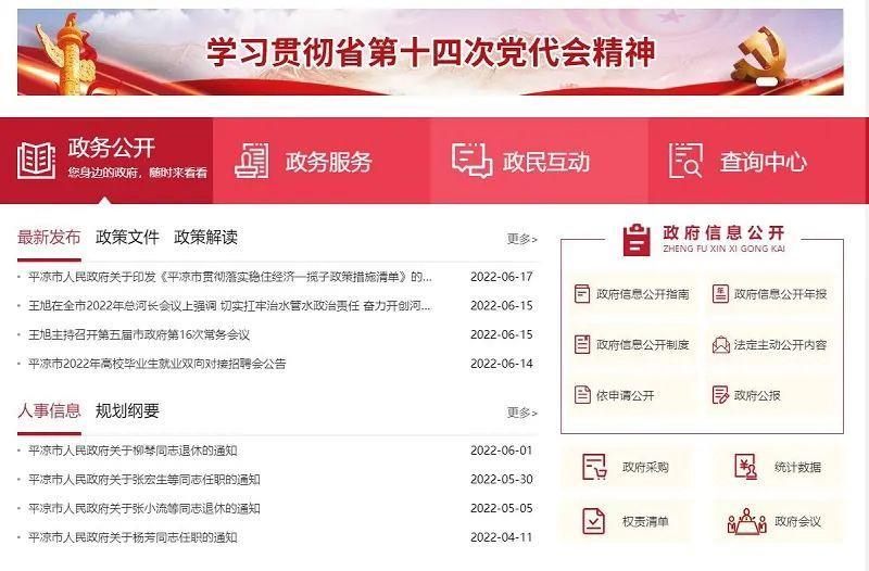 近期,平凉市人民政府网站(www.pingliang.gov.cn)新版正式上线运行。该网站由平凉市人民政府主办,市委网信办负责内容维护、市大数据服务中心负责技术运维。网站主要承担全市信息发布的主阵地、政务公开的主渠道、在线服务的主平台、政民互动的主桥梁、对外宣传的主窗口、数据开放的主枢纽等七项功能。