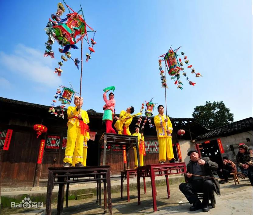 歌词“红灯往下传,高挂祭祀堂,祭奠祖先同歌舞,绕着红灯‘跳团团’”则形容的是花灯传至元、明时期的状况。“跳团团”后来又称为“门斗转”,这是秀山花灯最古老的称谓,也是花灯歌舞的基本形态。