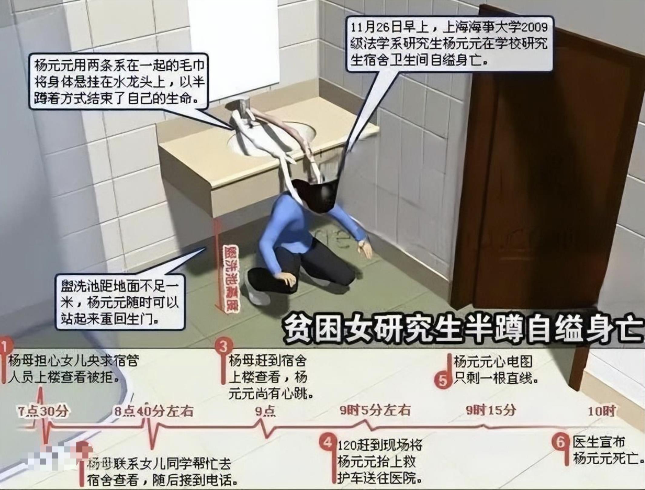 杨元元用两条系在一起的毛巾将身体悬挂在水龙头上,以半蹲着的方式结束了自己的生命。