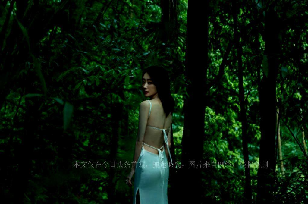 令人意想不到的是,张小斐女士选择了身着一袭白色镂空长裙,胸部与背部都大胆裸露出来,与青城山清秀婉约的山水景色形成了鲜明而对比鲜明的对比。