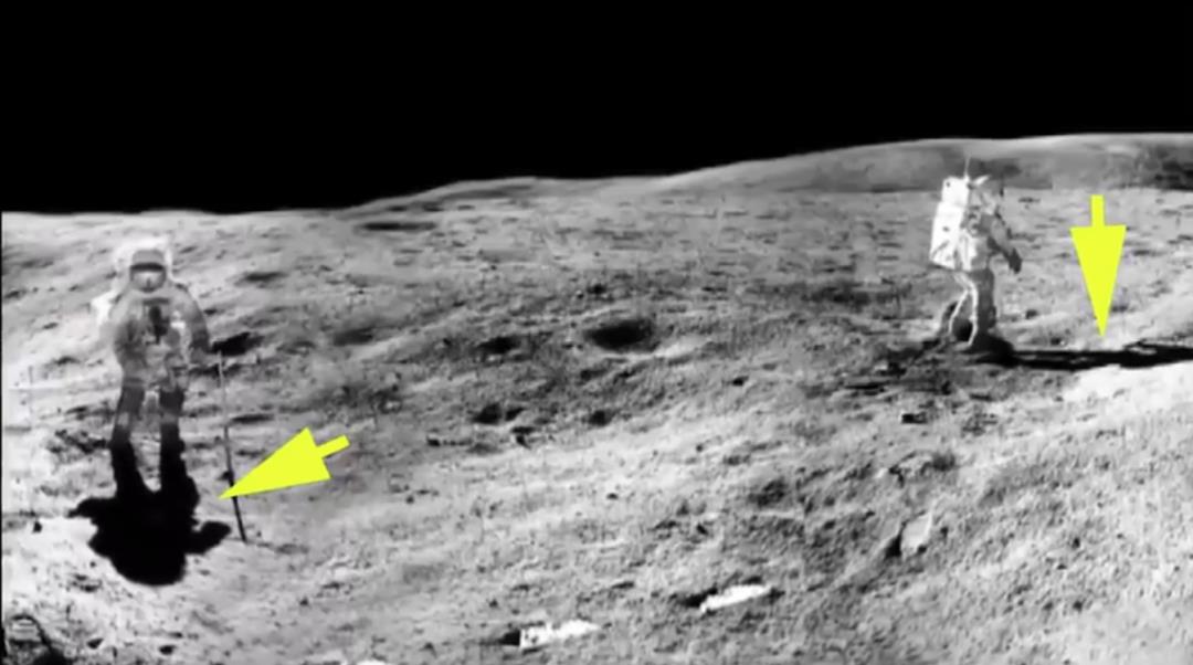 3、有人发现宇航员在月面上的影子方向不一样,一看就是有不同的光源。