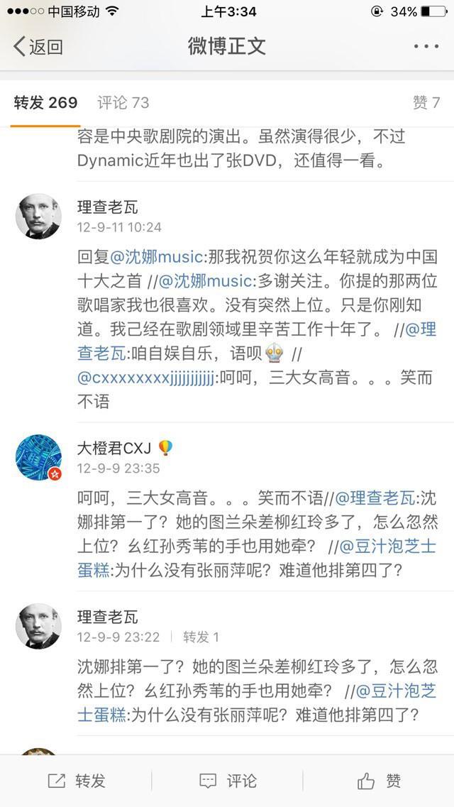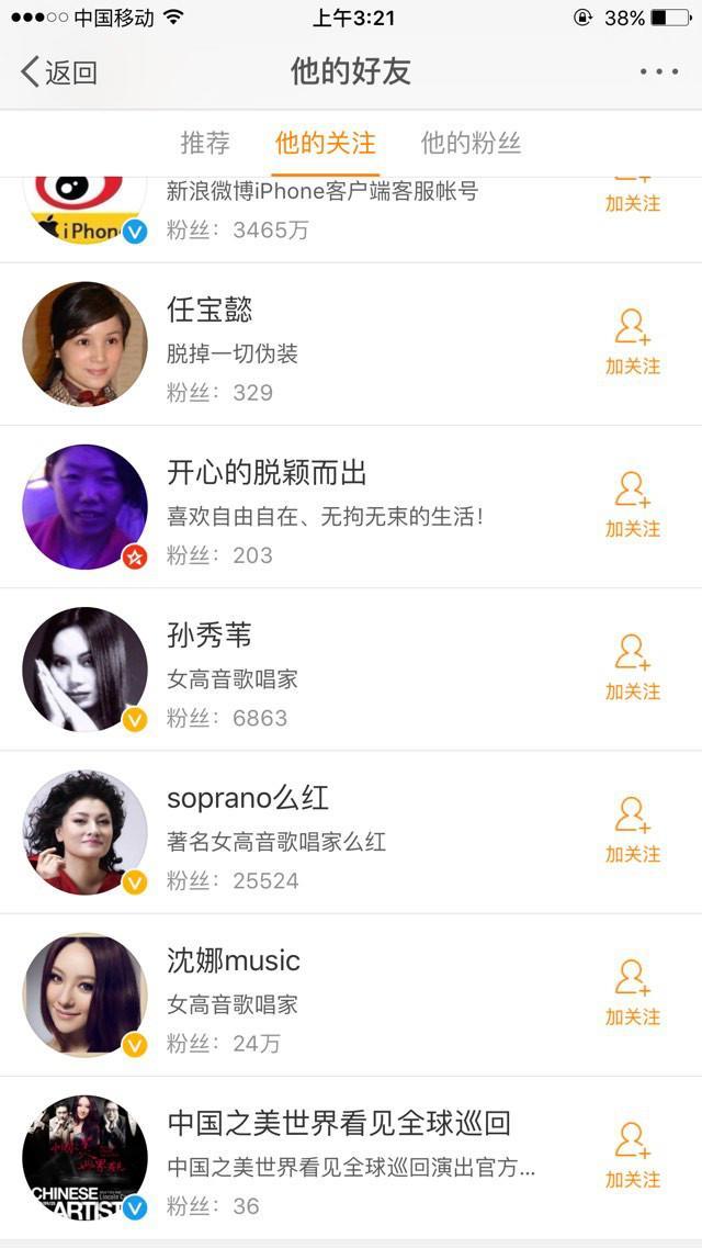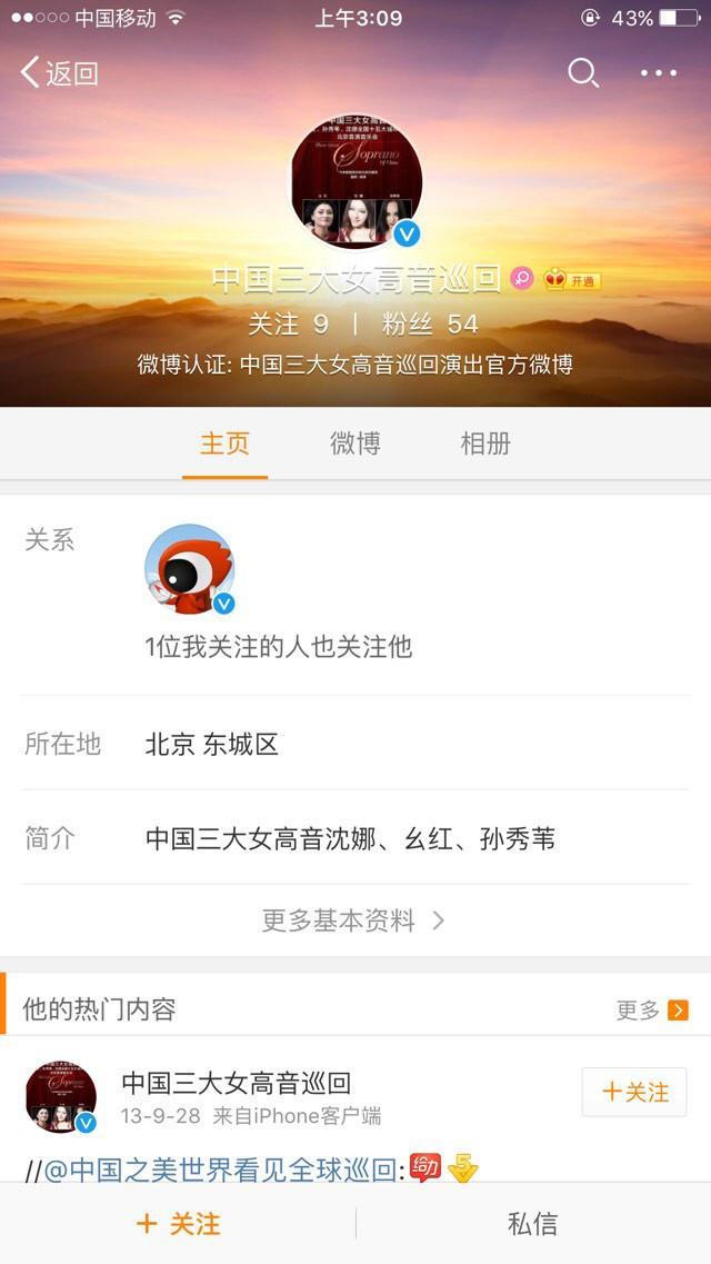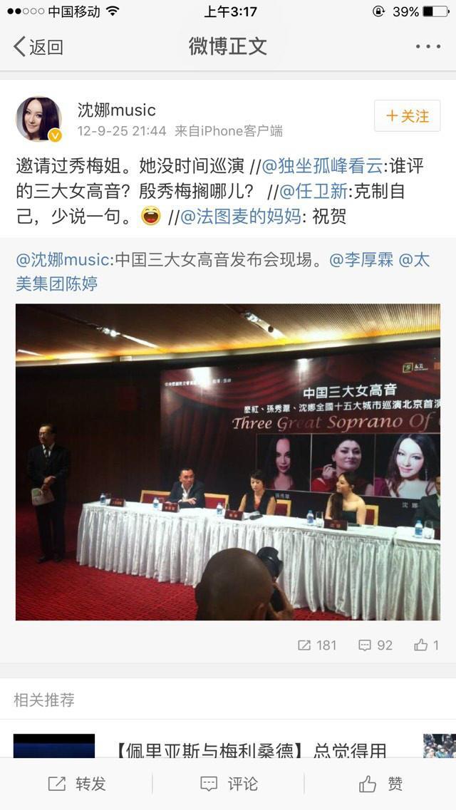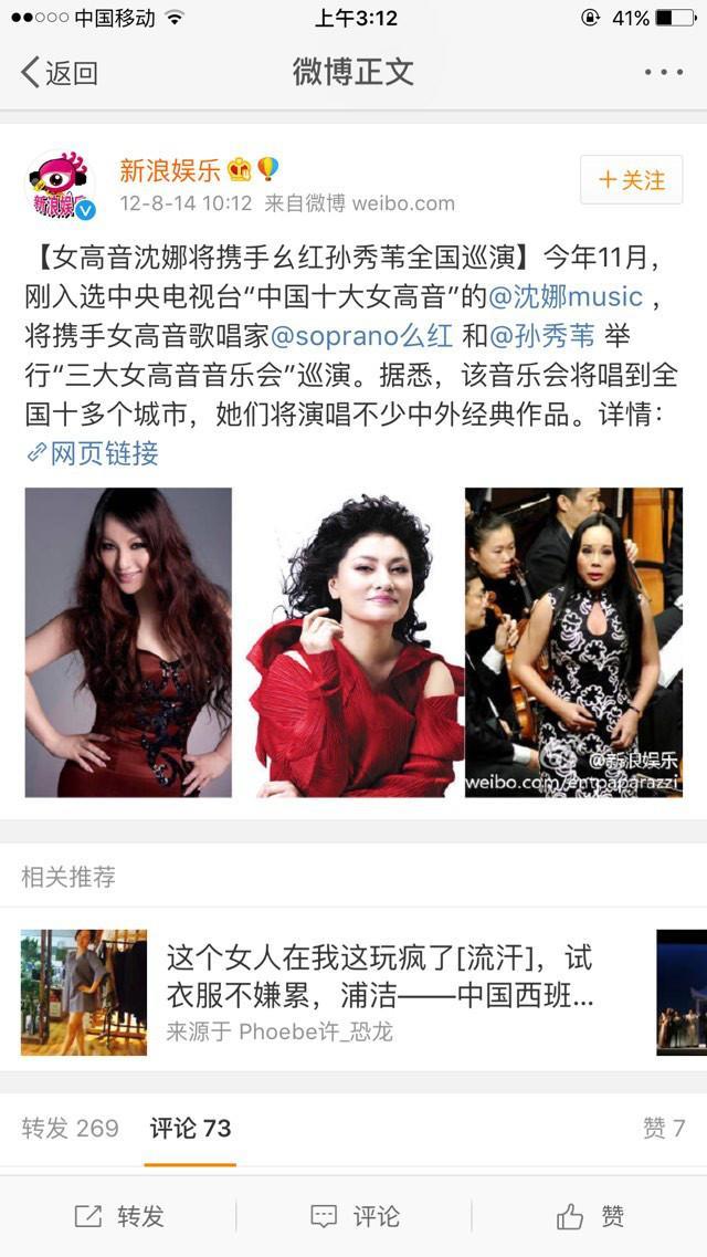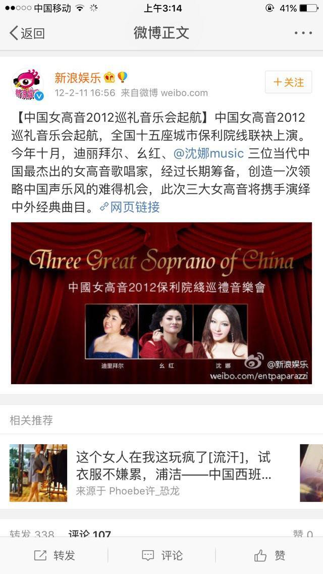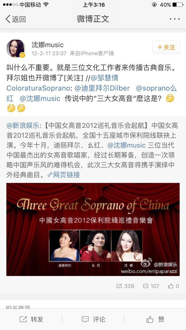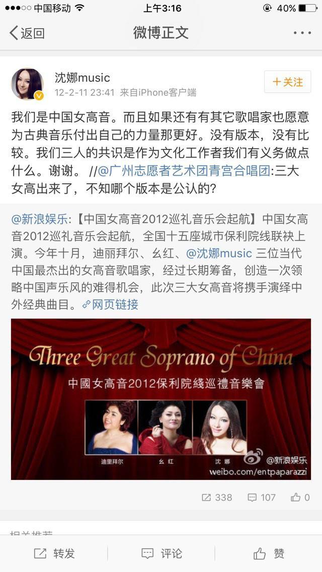 沈娜 是中国歌剧界最典型的自己往自己脸上贴金的代表 她自封三大女高音 从@沈娜music和@中国三大女高音巡回 这两个微博账号中可以看出所谓三大女高音的端倪 @中国三大女高音巡回 此微博公众号全部都是沈娜的个人宣传 从没有单独宣传过另外两位女高音 从其仅有的几个关注人里不难发现 @开心的脱颖而出 为沈娜的助理小号 @中国之美世界看见全球巡回 策划的也是沈娜自己的演出 这个就是所谓“致音乐,大师有约”的前身