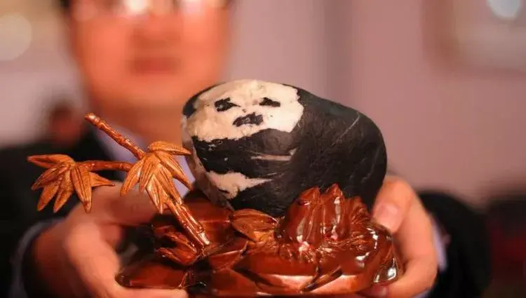 在湖北十堰奇石展上,一位石主在展示他收藏的熊猫形状奇石,石主介绍,这块奇石是他在河边捡到的,没有人工修饰过,天然生成,非常罕见。有位老板出1万元购买遭到拒绝,石主说,这块熊猫石远不止这个价