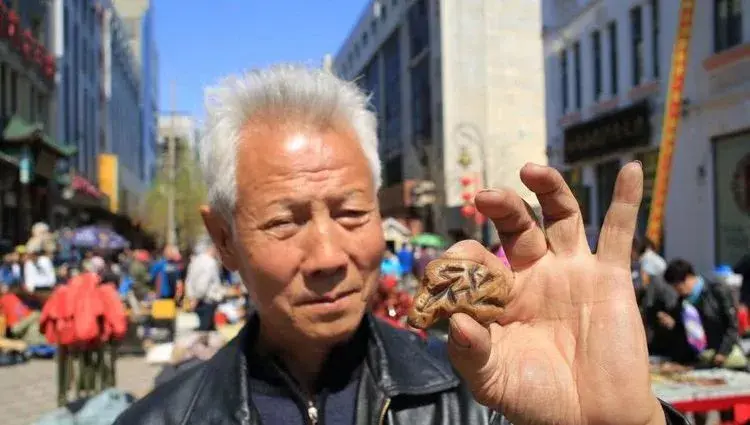 在哈尔滨一街道边,一位姓辛的老人摆地摊卖古玩,老人手拿着一个红褐色的玛瑙石向过往的市民介绍,这块小玛瑙石上面有天然生成的一个“祉”字,是他在嫩江边捡到的,出售10万元,少于这个价,坚决不卖。
