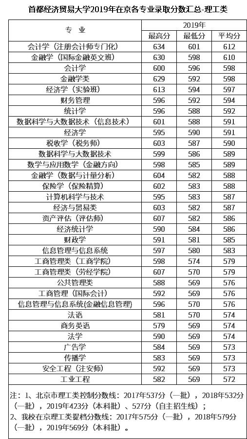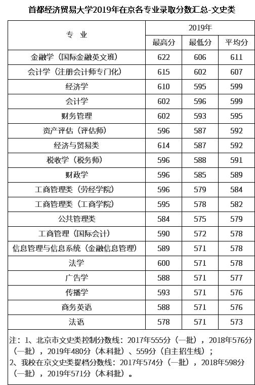 以下表格是首都经济贸易大学2019年的录取分数情况。