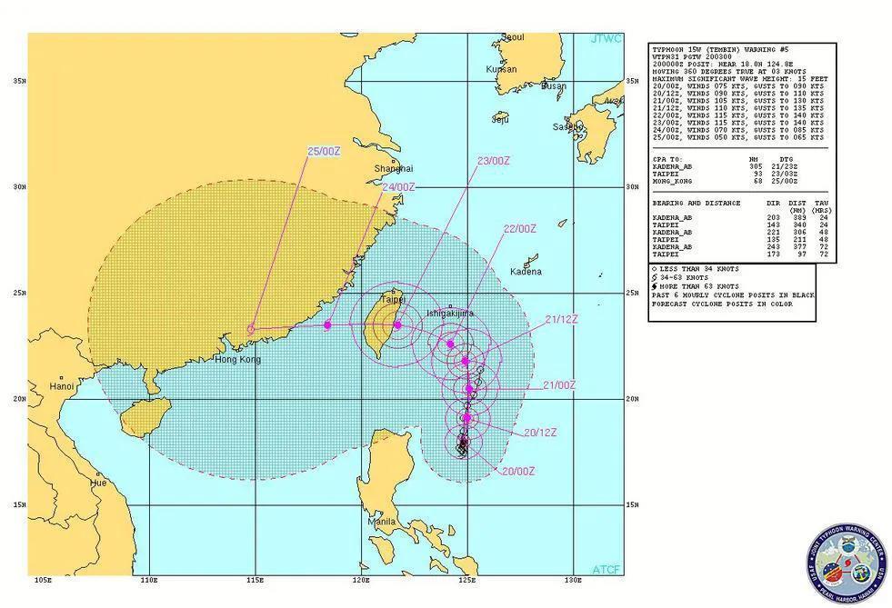 云娜随后继续以时速15公里向西北方向推进,朝向台湾。