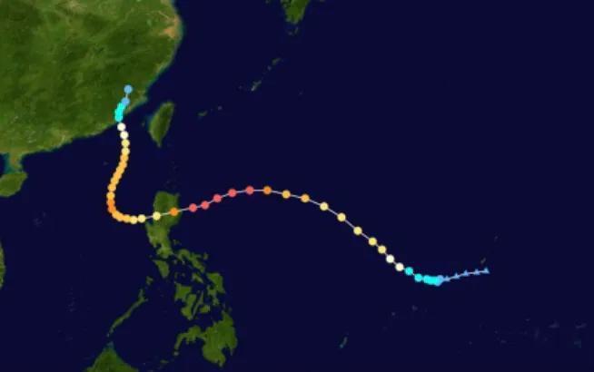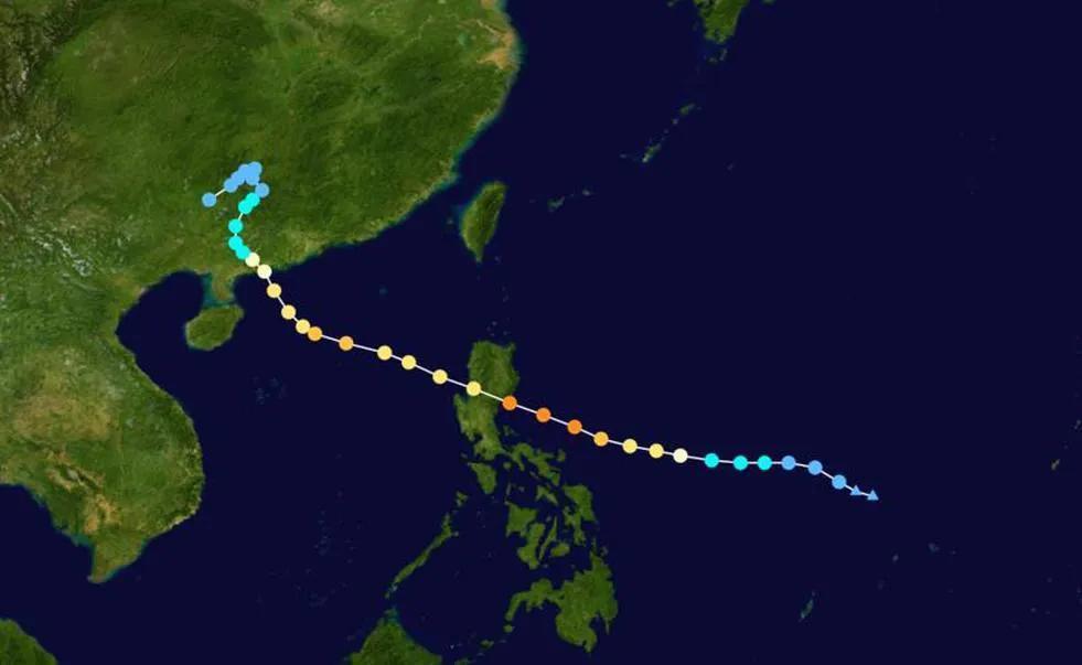 10月21日12时40分前后,其中心在广东省汕尾市海丰县鲘[hou]门镇登陆,登陆时中心附近最大风力有14级(42米/秒),是有气象记录以来10月下旬以后登陆广东的最强台风。