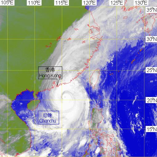 8月23日7时加强为强台风,一天连跳两级,最强达15级(48m/s,年鉴中修改为16级,52m/s),12时50分前后以强台风级(14级,45m/s)在中国广东省珠海市登陆。