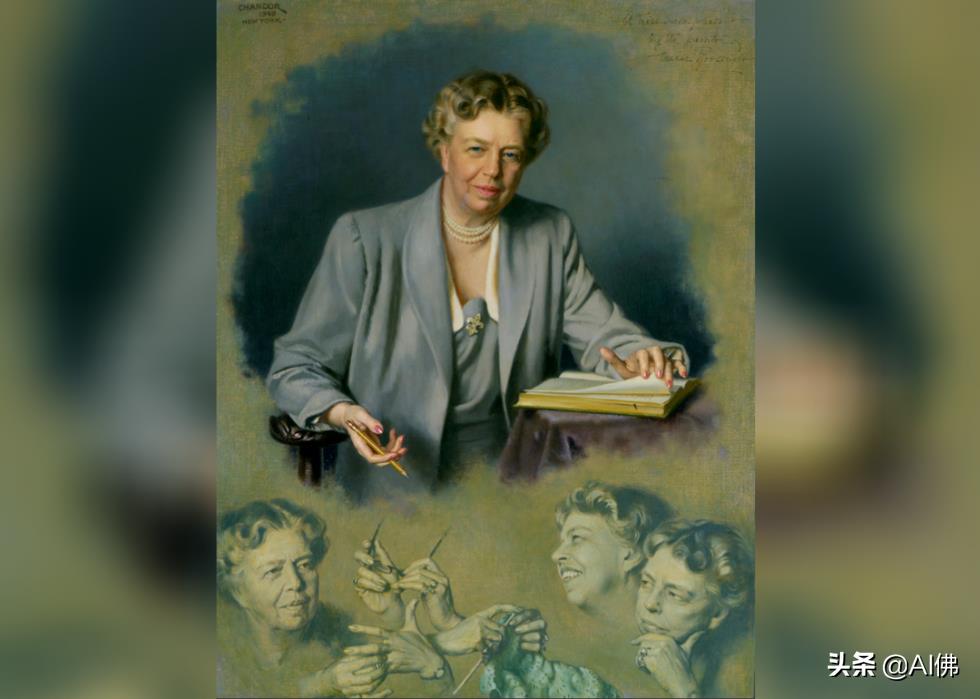 道格拉斯钱达从他在纽约的工作室画埃莉诺·罗斯福的肖像在1949年,但它不会成为她的官方图片,直到1966年的第一夫人伯德约翰逊夫人举行招待会,公布的肖像,这表明罗斯福写在日记上面其他她编织、思考和拿着结婚戒指的描绘。钱多尔被认为是那个时代的顶级艺术家之一,史密森尼国家肖像画廊展出了温斯顿·丘吉尔、赫伯特·胡佛总统和富兰克林·罗斯福总统的肖像。