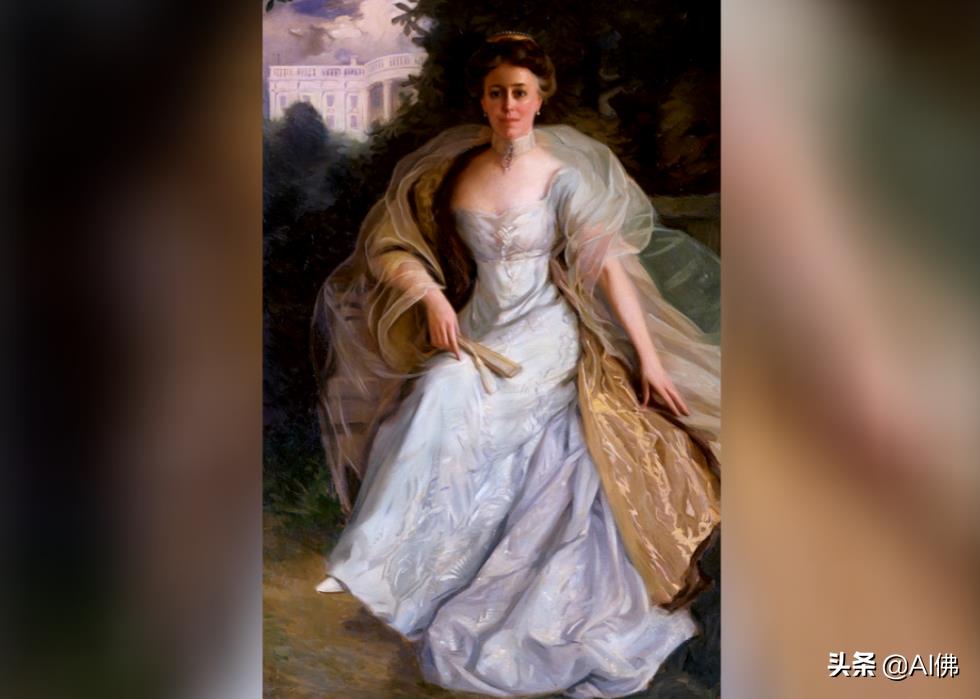 与她的丈夫不同,第一夫人伊迪丝·罗斯福 (Edith Roosevelt)于 1902 年保留了艺术家西奥博尔德·查特兰 (Theobald Chartran) 的肖像。罗斯福身着正装,在花园里戴着帽子和手杖,负责白宫的重大建设。在改造住宅以适应她的大家庭时,她的装修导致了西翼的创建,她的丈夫创造了“白宫”一词。