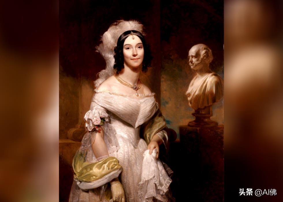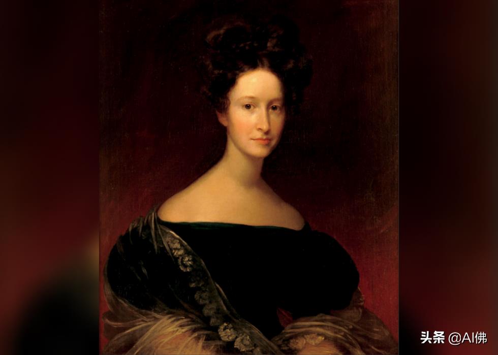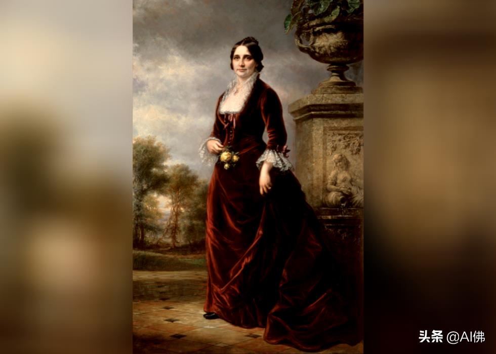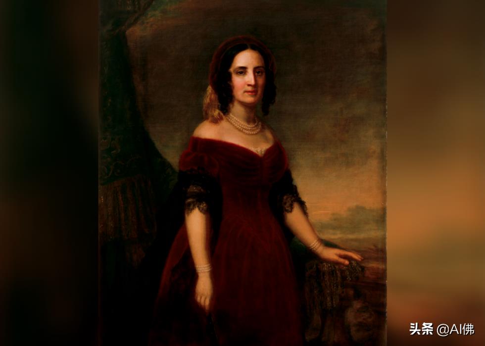 约翰·泰勒总统的第二任妻子在他的第一任妻子第一夫人朱莉娅去世后与他结婚,由肖像画家弗朗西斯科·阿内利 (Francesco Anelli) 在 1846 年至 1848 年间绘制,当时她 20 多岁。据白宫历史协会称,第一夫人朱莉娅出身于一个富有的纽约家庭,被称为“长岛玫瑰”,1863 年成为约翰·泰勒总统的遗孀,这对她来说是一个沉重的打击。与第一夫人的肖像一起,意大利裔美国艺术家阿内利以其画作《世界的尽头》而闻名,这幅画已失传。