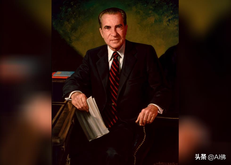 理查德·尼克松总统的肖像由詹姆斯·安东尼·威尔斯于 1984 年绘制,悬挂在白宫东厅的大楼梯上。尼克松于 1974 年在水门事件丑闻中辞职,在德怀特艾森豪威尔手下担任副总统,其官方肖像也由威尔斯完成。