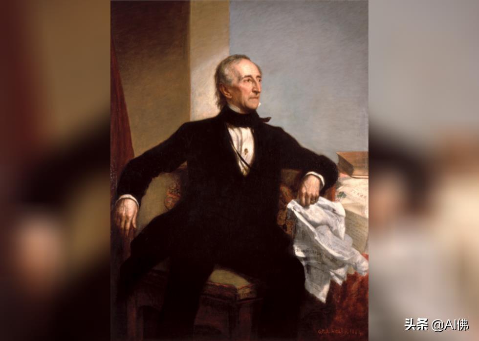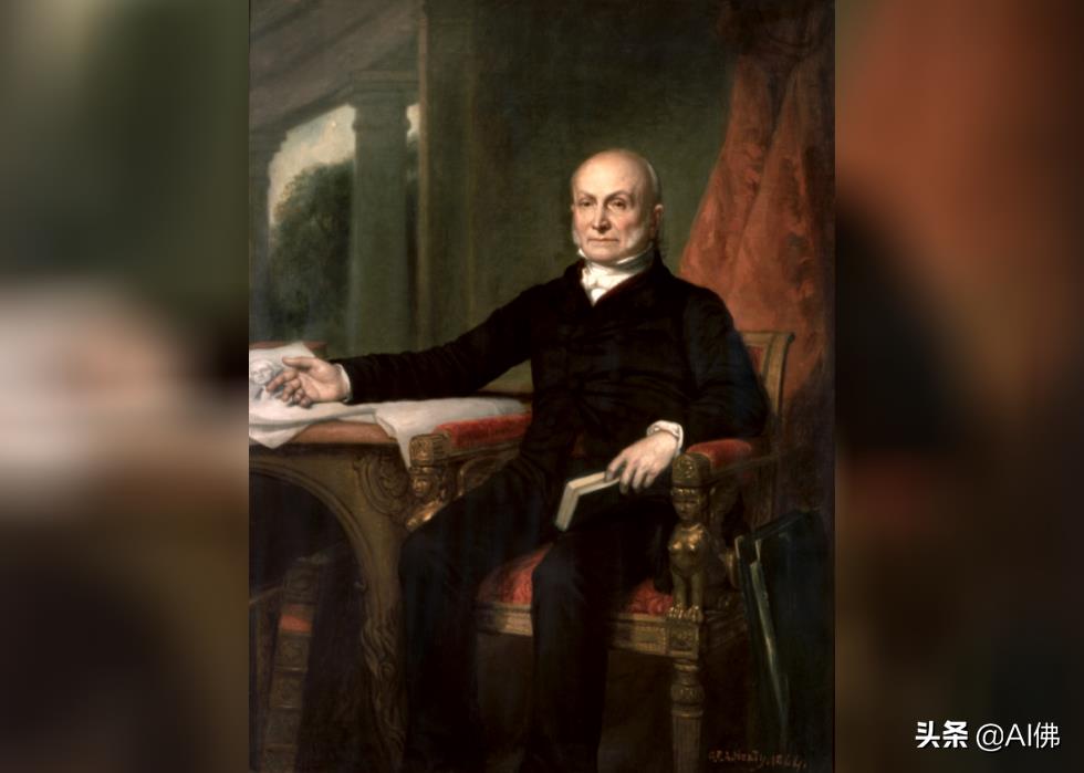 美国第六任总统约翰·昆西·亚当斯 (John Quincy Adams) 是美国第二任总统约翰·亚当斯 (John Adams) 的儿子,坐在红色窗帘前的玫瑰色天鹅绒椅子上,在成为美国领导人之前完成了他的肖像画。他是唯一一位在担任总司令后成为众议院议员的总统,后来在 1848 年反对美墨战争时中风倒在国会大厦。两天后他去世了。白宫肖像画由当时著名的肖像画家乔治·彼得·亚历山大·希利 (George Peter Alexander Healy) 于 1818 年创作。