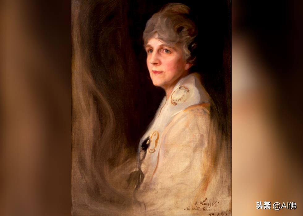 出生于瑞士的印象派画家阿道夫·穆勒·尤里 (Adolfo Muller-Ury) 曾在 1903 年创作过查尔斯·施瓦布( Charles Schwab)等著名人物的作品,他曾为伊迪丝·威尔逊 (Edith Wilson) 画过官方肖像。威尔逊被认为是有史以来最有权势的第一夫人之一,基本上是在 1919 年伍德罗·威尔逊中风后担任总统。庄严的伊迪丝的肖像在华盛顿特区的伍德罗·威尔逊故居展出