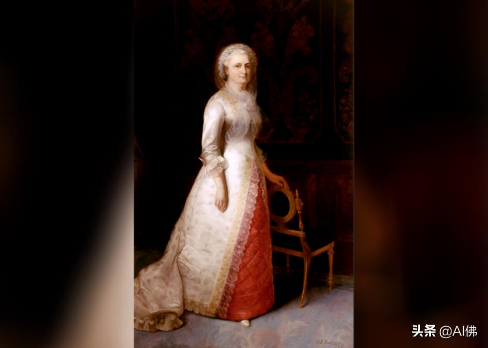 第一夫人玛莎·丹德里奇·卡斯蒂斯·华盛顿 (Martha Dandridge Custis Washington) 的肖像散发着白色和栗色的光芒,描绘了第一任总统的爱情,坚忍地站在椭圆形靠背的椅子旁边。然而,乔治并不是她的第一任丈夫;在被富有的种植园主丹尼尔·帕克·卡斯蒂斯 (Daniel Parke Custis) 守寡后,她嫁给了他。正是她受人尊敬的社会地位帮助她的丈夫乔治赢得了总统职位,使这对夫妇成为新共和国领导人的首任标兵。