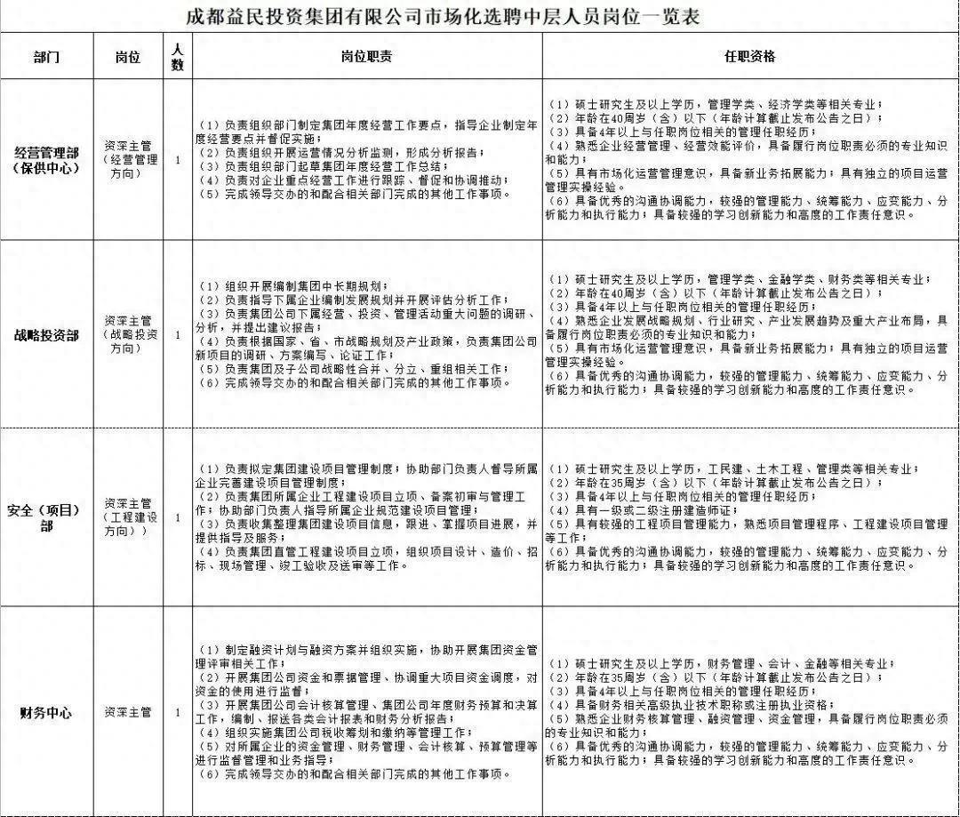 一、市场化选聘(一)选聘职位1.成都益民投资集团有限公司经营管理部(保供中心)资深主管(经营管理方向)1名。2.成都益民投资集团有限公司战略投资部资深主管(战略投资方向)1名。3.成都益民投资集团有限公司安全(项目)部资深主管(工程建设方向)1名。4.成都益民投资集团有限公司财务中心资深主管1名。