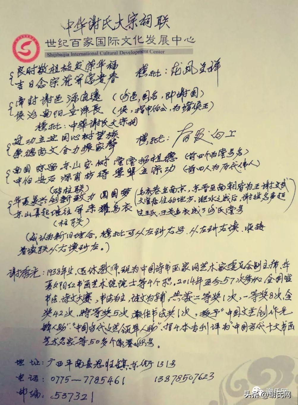 中华谢氏大宗祠应征联稿: