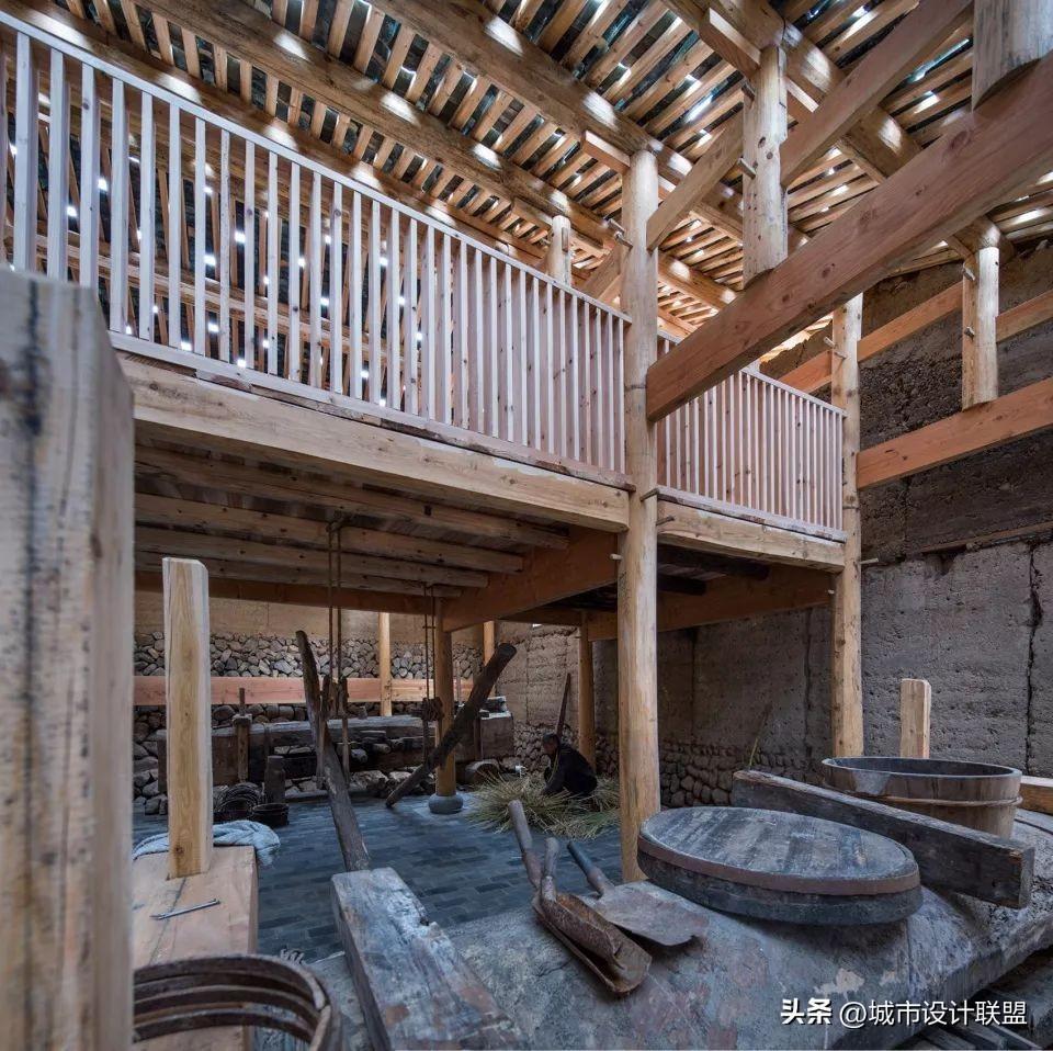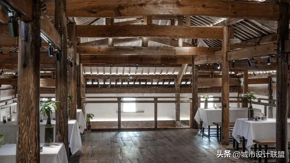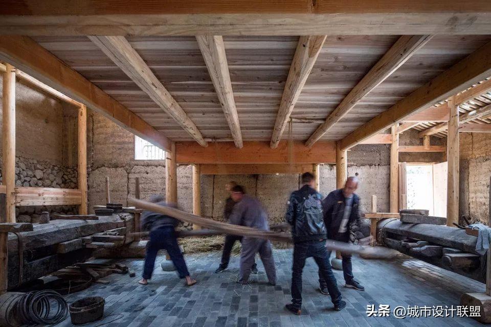 通过结构改造和加固,把旧建筑一层的梁和楼板锯掉,让旧建筑呈现出最大的空间潜力,成为村子公共空间的一部分,身在大厅之中,像是同时在建筑内外。