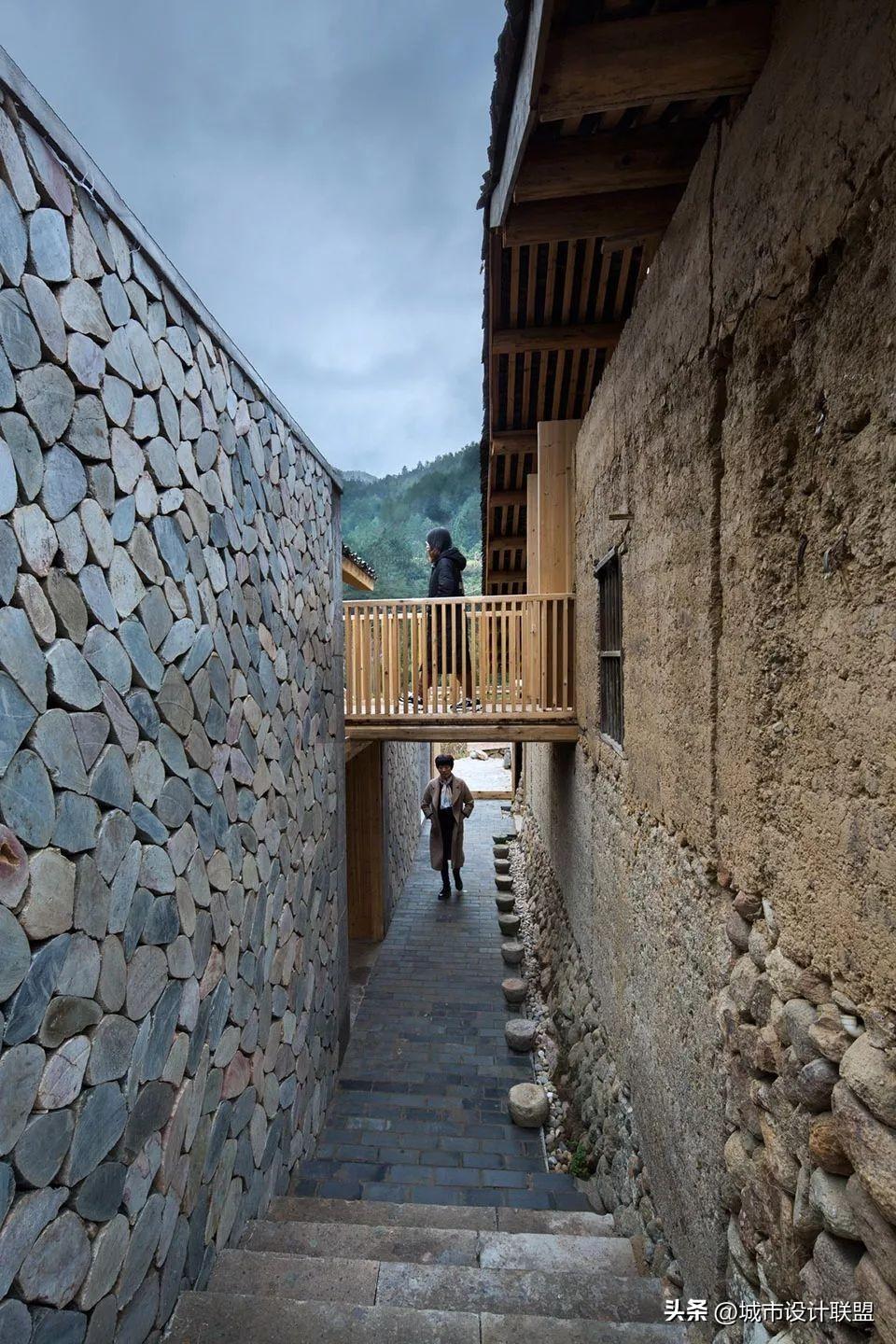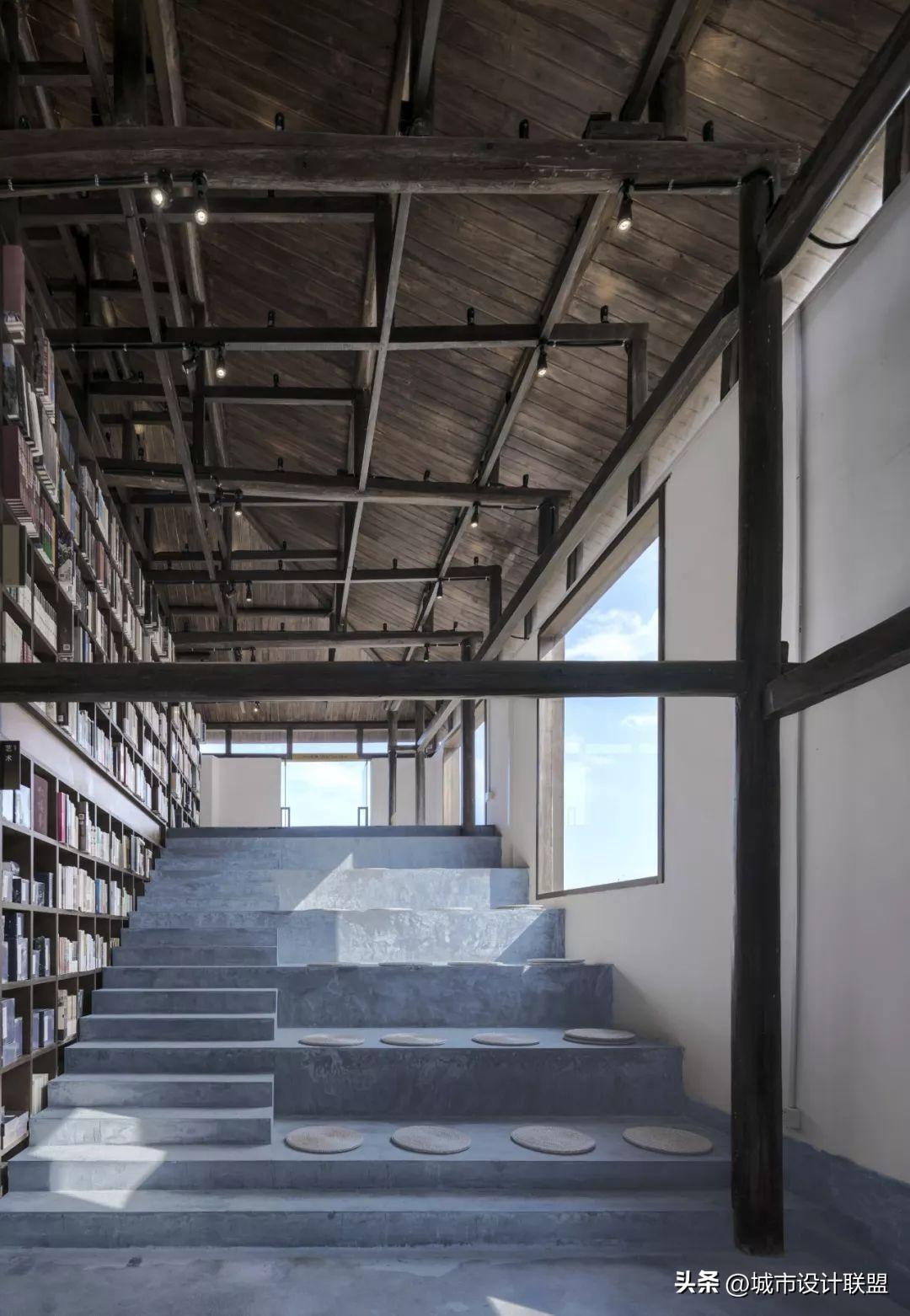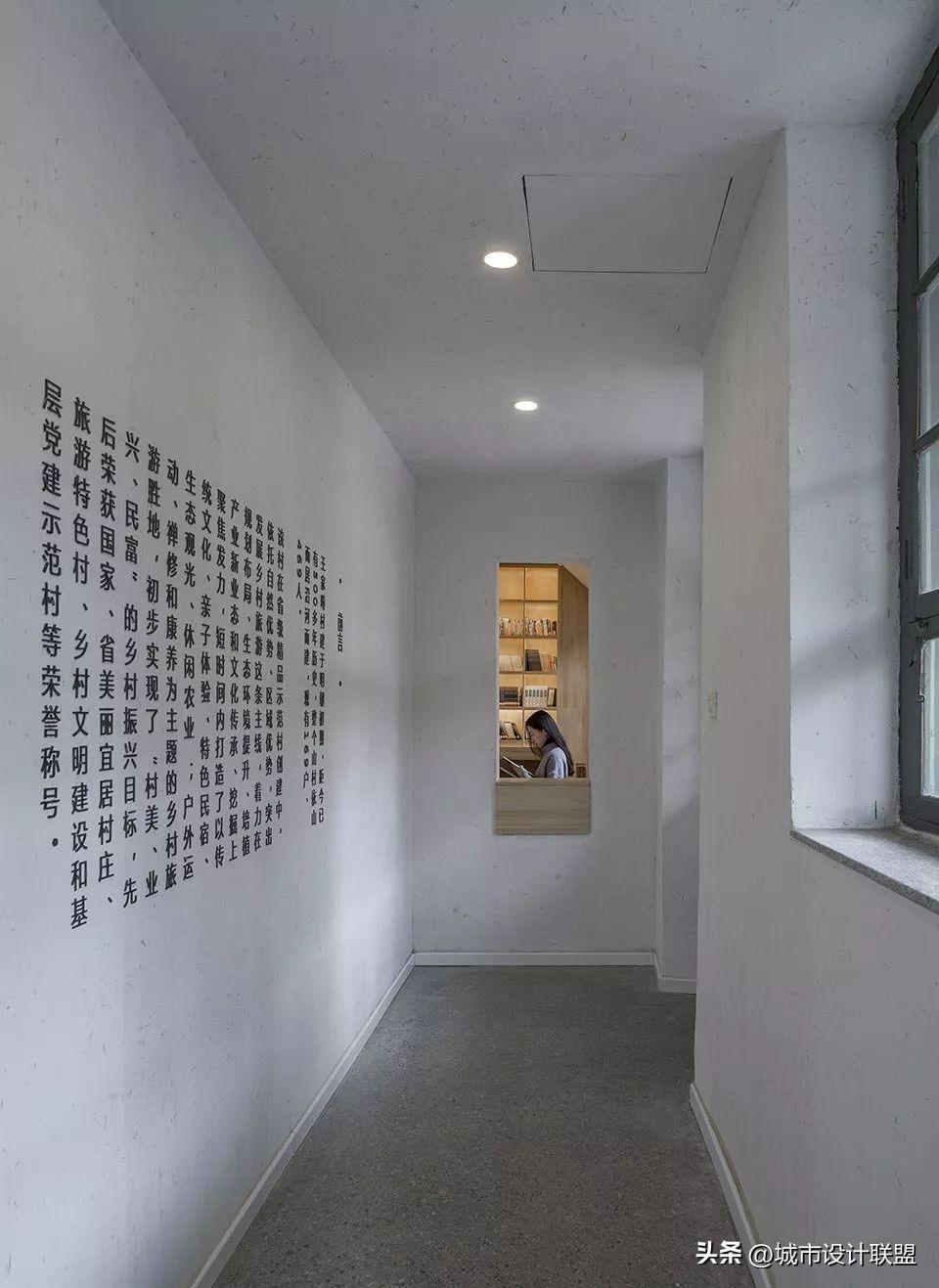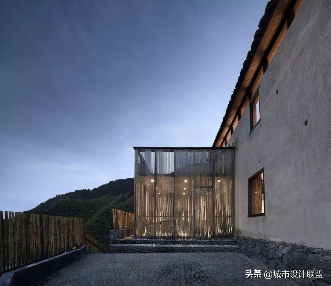 设计师在大空间中尽量多的设置天窗,使风景最大化的映入室内,也尽可能减少对周边民宅的干扰。施工中大量使用就地取材的乡土材料,门窗由村里的老工匠制作。