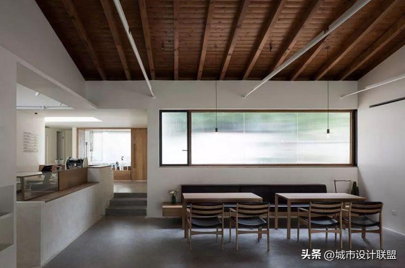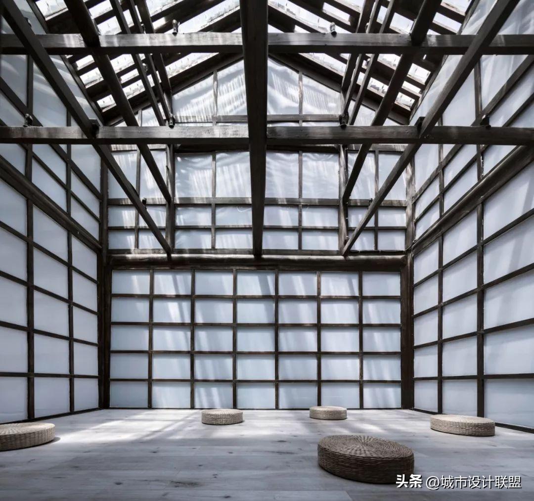 玻璃、阳光板,这些纯净透明的材料,作为传统木结构的背景,空间的划分强化了原有传统材料的秩序。
