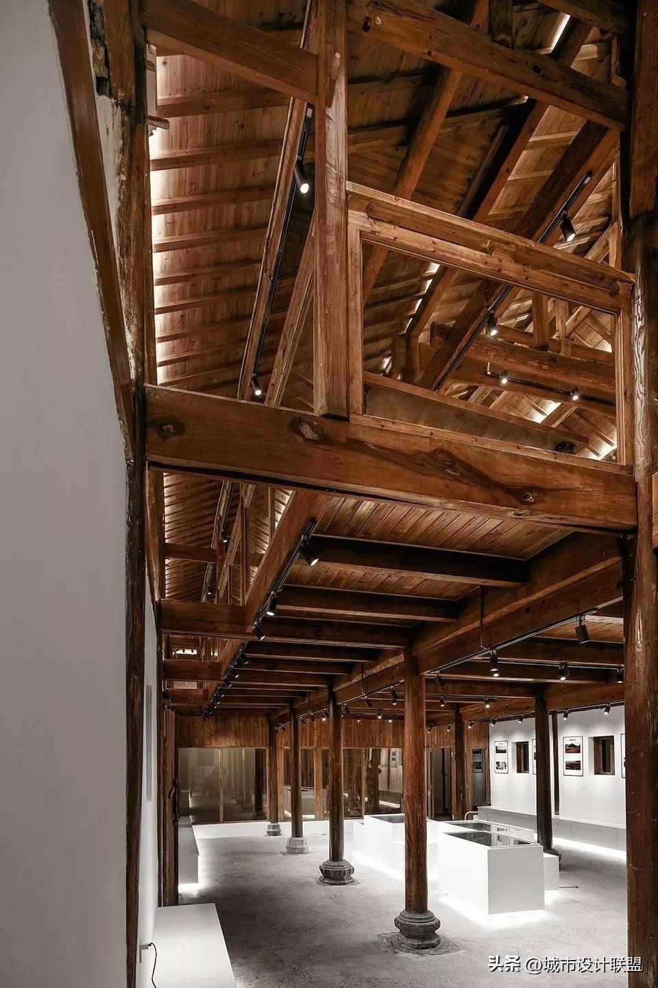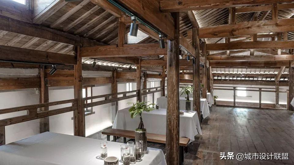 少量的玻璃、阳光板这些纯净透明半透的材料,作为传统木结构的背景存在,空间的划分组织依然附着并强化了原有传统材料的形式秩序。