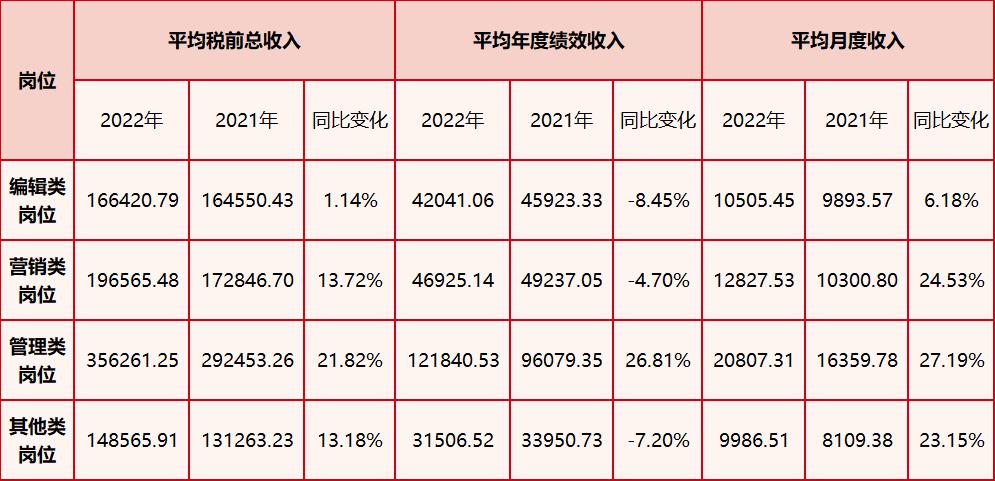毫不意外,2022年平均税前总收入最高的还是管理类岗位从业人员,为356261.25元,同比增长21.82%。编辑类岗位与营销类岗位从业人员2022年平均税前总收入分别为166420.79元和196565.48元,后者比前者高出18.11%,分别同比增长了1.14%和13.72%。4大主要岗位类型中,平均税前总收入均有所增长。