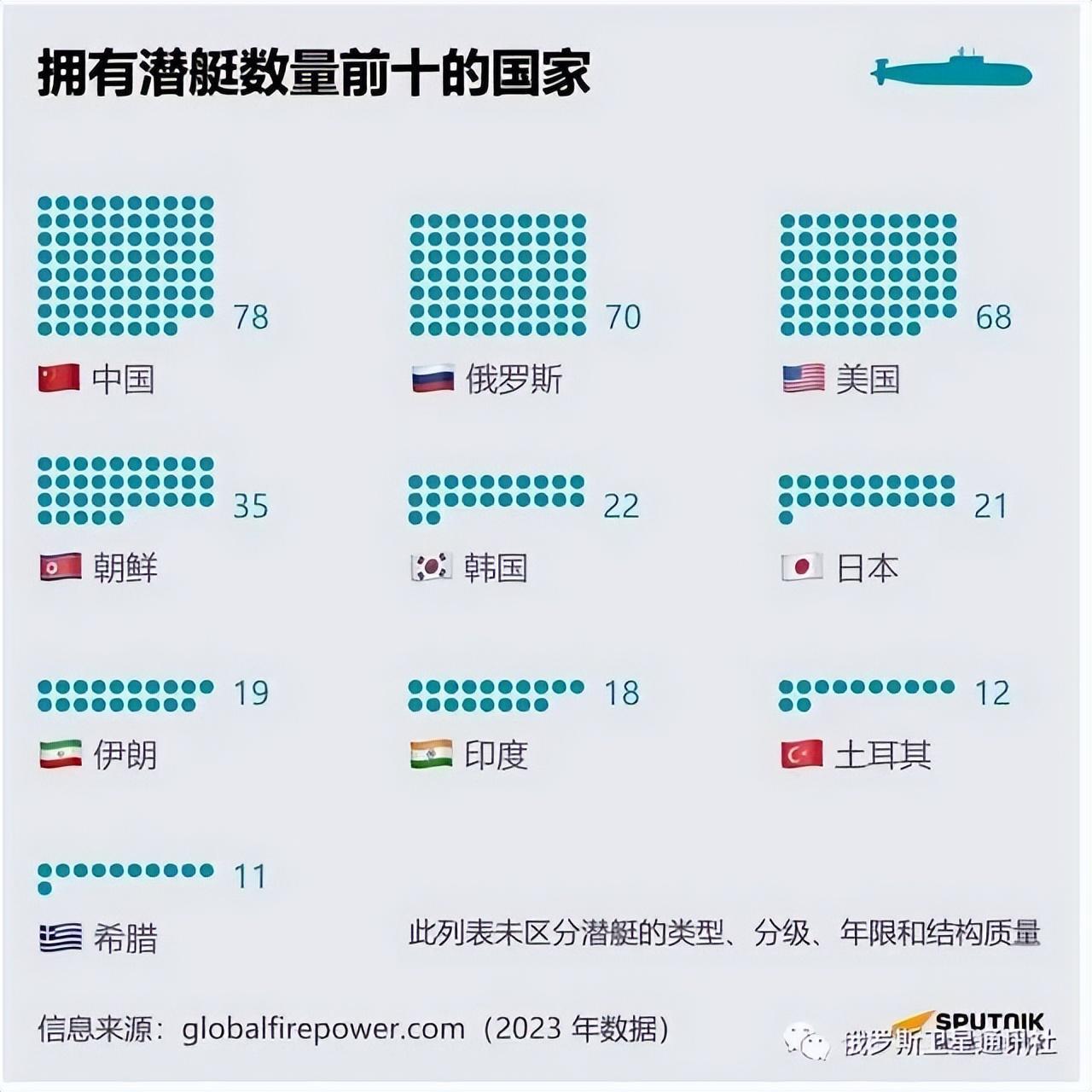 俄罗斯卫星通讯社排出的这份图表,是根据“全球火力排行”网站2023年的最新数据列出的。该排行榜显示,中国拥有78艘潜艇、俄罗斯为70艘,美国是68艘。接下来是东北亚三强:朝鲜35艘、韩国22艘、日本21艘,不愧为“东亚怪物房”出来的选手。之后分别是伊朗(19艘)、印度(18艘)、土耳其(12艘)和希腊(11艘)。至于外界印象里的传统海军强国,例如英国、法国和德国等,都没有上榜。