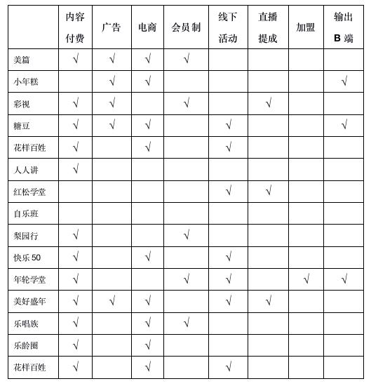 现有老年群体的文教娱乐行业的商业变现和盈利模式,主要基于:内容付费、广告、电商、会员制费用、线下活动衍生、直播提成、加盟费等,如下择取一些代表性公司的盈利渠道进行对比分析。