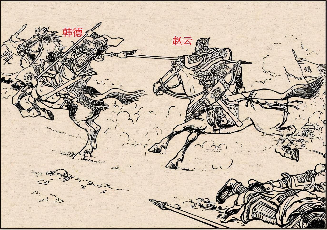 长坂坡的钟缙(钟绅的兄弟),被赵云一枪刺死;凤鸣山的韩德,在四子被赵云团灭后,怒不可遏地上前报仇,被赵云一枪挑落,终于领了全家桶。