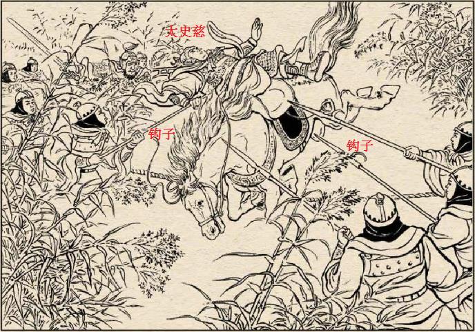 周瑜定计收降太史慈,就是设下陷坑和绊马索,在太史慈中招后,钩子手蜂拥而上,一举将太史慈生擒。关羽走麦城,马失前蹄后,也是遭遇铁钩、钩镰枪,最终被马忠生擒。